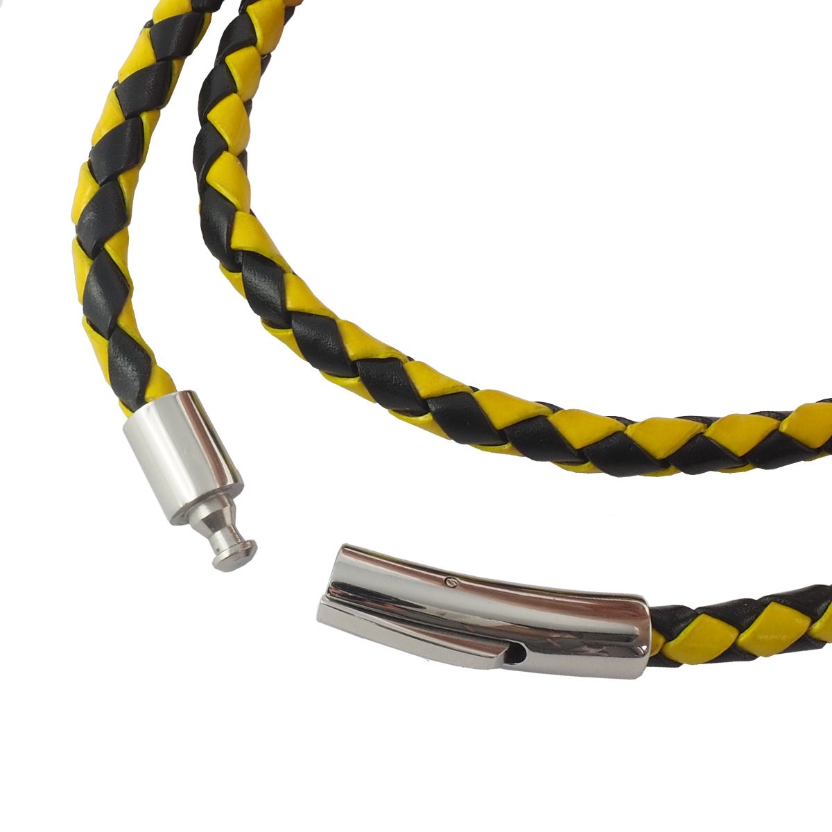 Lederkette Lederband 4 mm Herren Halskette Schwarz / Gelb 17-100 cm lang mit Hebeldruck Verschluss Silber geflochten