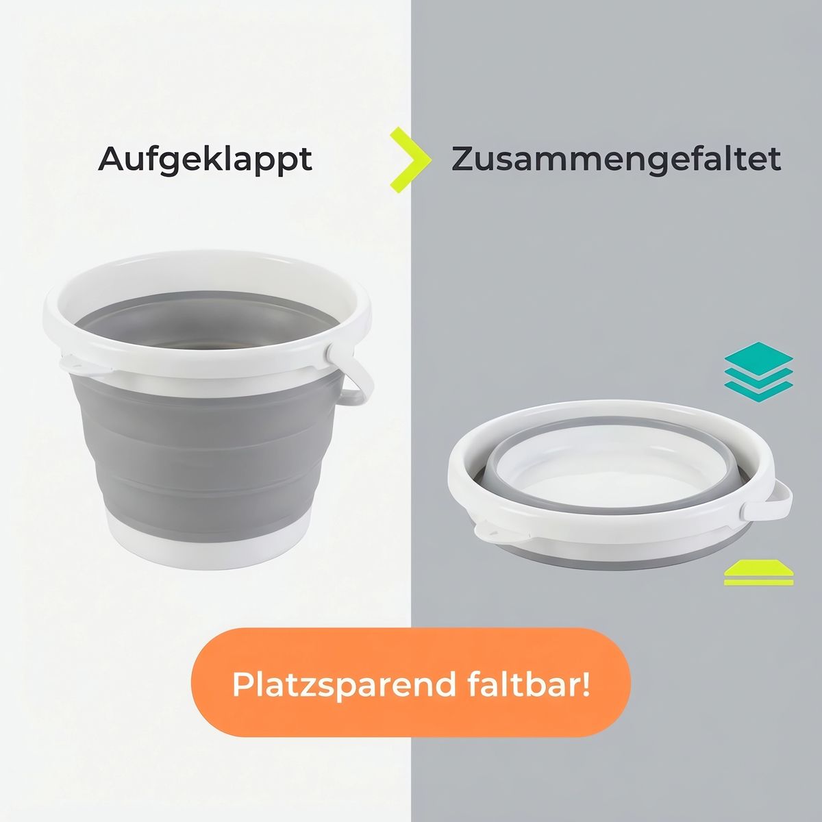 Faltbares Design: Der Wassereimer kann bei Nichtgebrauch platzsparend zusammengefaltet werden, was ihn ideal für Reisen und platzbeschränkte Umgebungen macht.