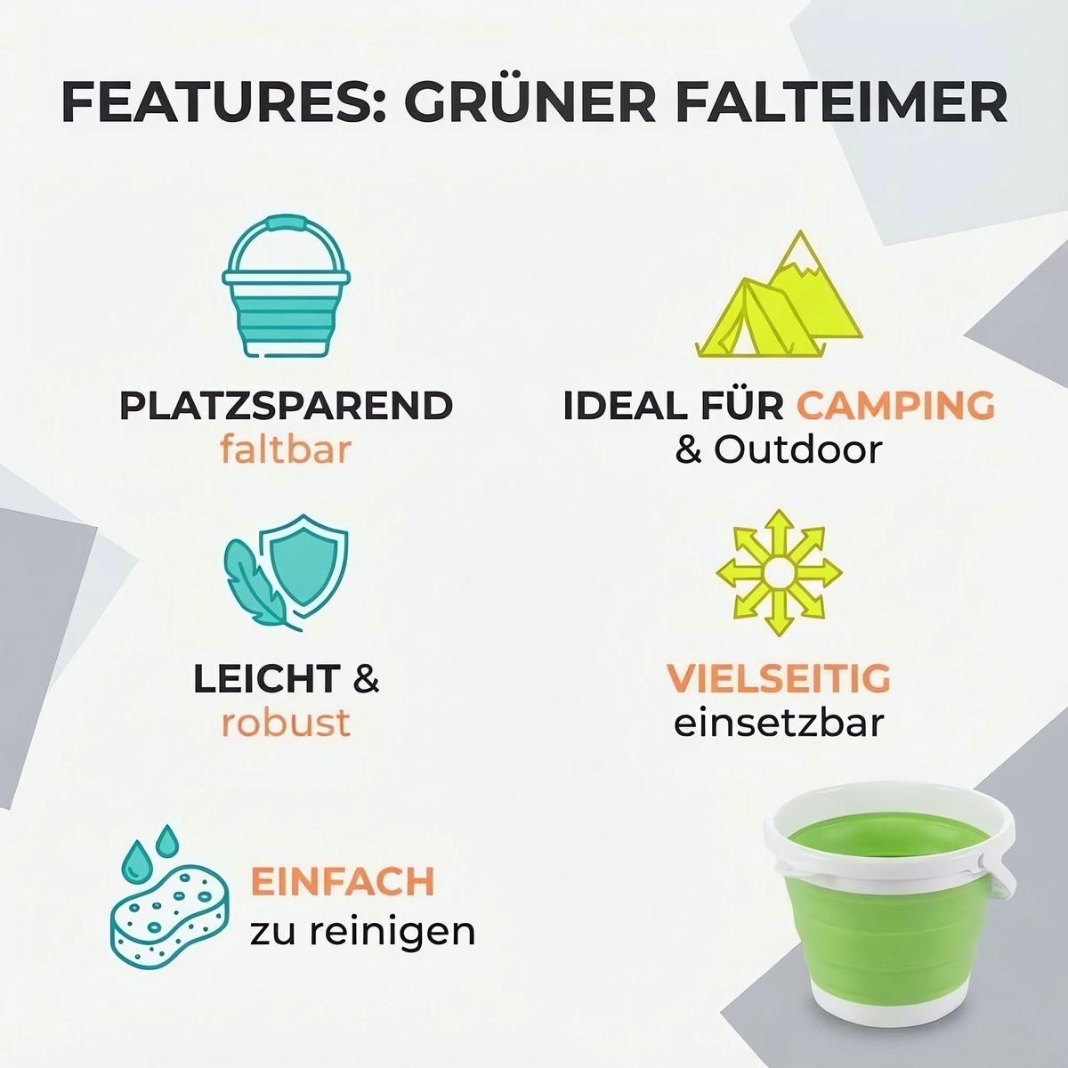 Das faltbare Design ermöglicht es Ihnen, den Eimer bei Bedarf einfach zu öffnen und nach Gebrauch kompakt zusammenzufalten. Dies ist besonders nützlich, wenn Sie wenig Platz zur Verfügung haben oder ihn auf Reisen mitnehmen möchten. In zusammengefaltetem Zustand nimmt der Eimer nur minimalen Raum ein, was ihn zur idealen Lösung für Campingausflüge oder Reisen mit begrenztem Stauraum macht.