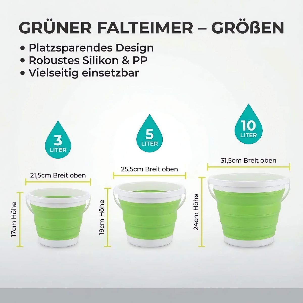 Der faltbare Wassereimer von König Design ist in drei verschiedenen Größen erhältlich: 3 Liter, 5 Liter und 10 Liter. Diese Auswahl ermöglicht es Ihnen, die richtige Kapazität für Ihre spezifischen Bedürfnisse auszuwählen. Ob Sie nur ein kleines Gefäß zum Gießen von Pflanzen benötigen oder einen größeren Eimer für die Autowäsche oder das Camping, es gibt eine passende Größe für Sie.