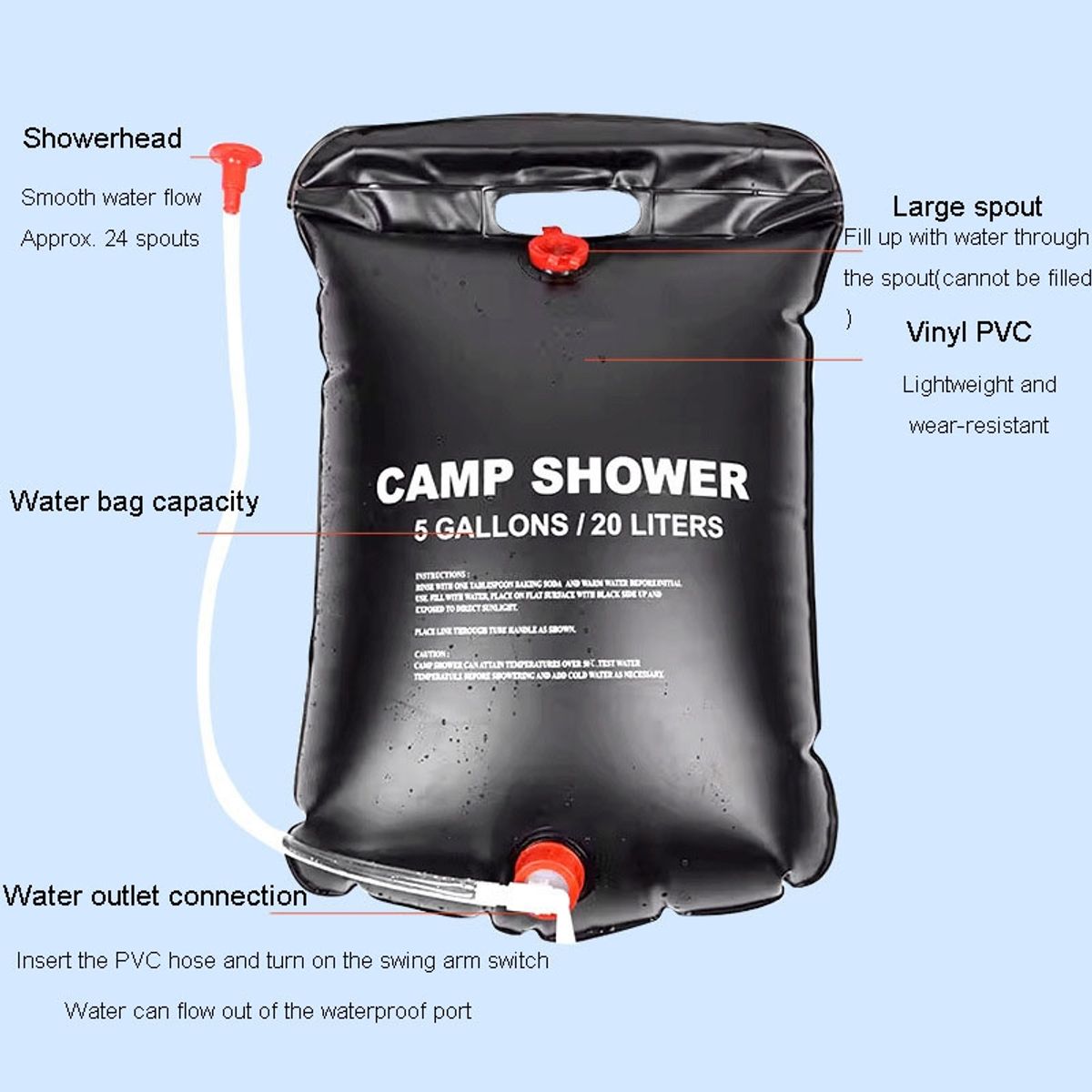 - Leicht und tragbar: Das Produkt ist aus leichtem, aber robustem PVC-Material gefertigt, das sich einfach zusammenfalten lässt. Dadurch ist die Solardusche ideal für unterwegs, sei es beim Camping, Wandern oder anderen Outdoor-Aktivitäten.