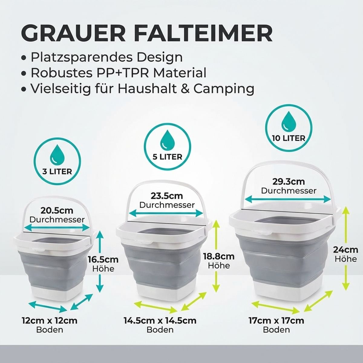 - Platzsparendes Design: Dieser Eimer verfügt über ein zusammenklappbares Design, das es ermöglicht, ihn bei Nichtgebrauch platzsparend zu verstauen. Er lässt sich flach zusammenfalten und nimmt daher wenig Platz ein.